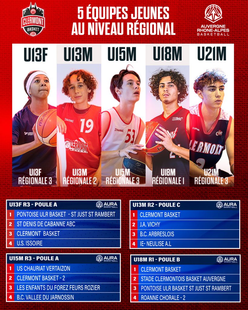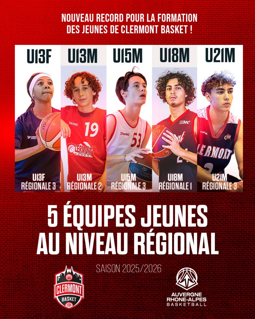 La Ligue Auvergne-Rhône-Alpes de Basketball a dévoilé les poules des championnats jeunes pour la saison à venir… et la nouvelle est de taille pour Clermont Basket : cinq de nos équipes évolueront au niveau régional !